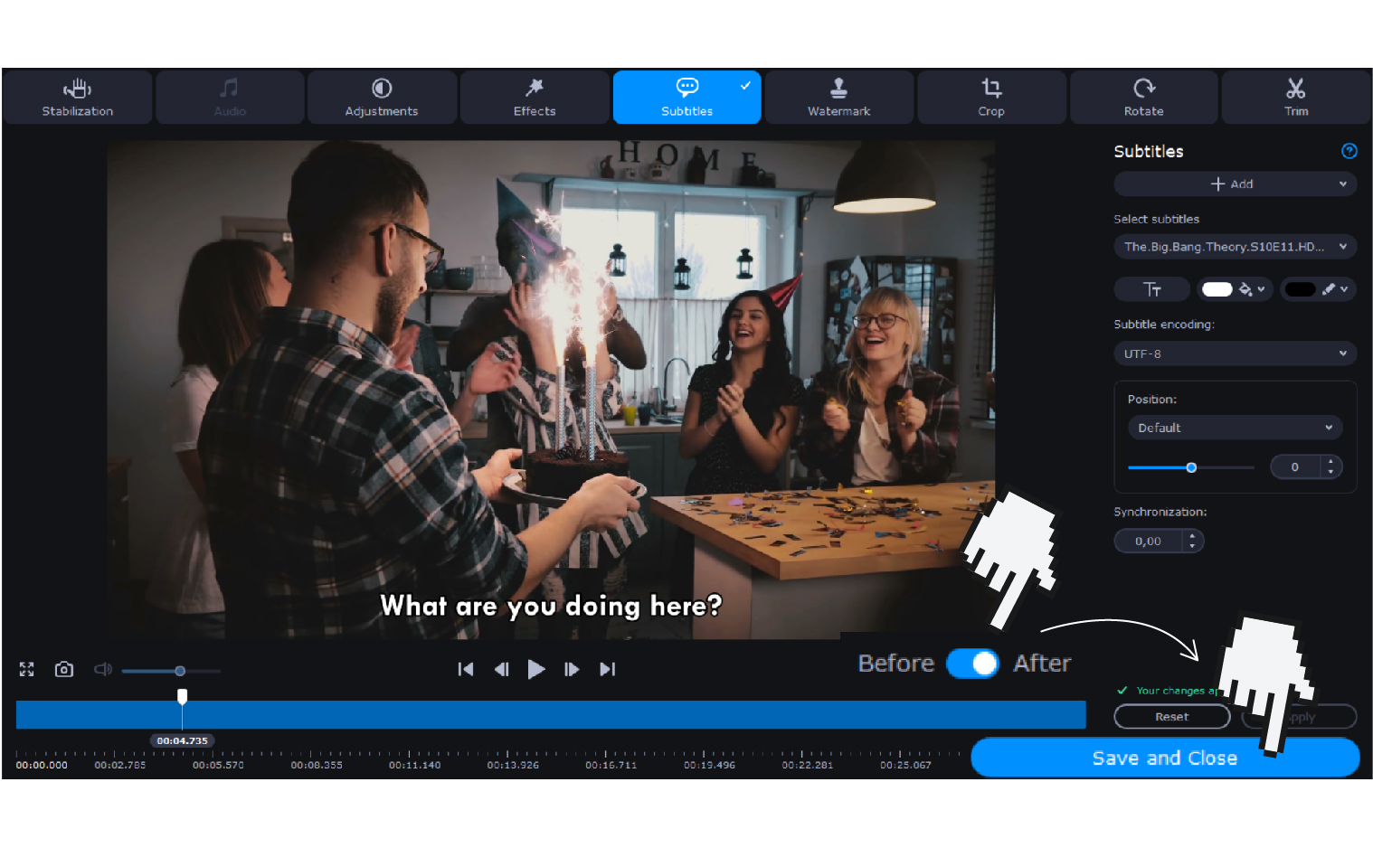 Next, set the position for your subs and synchronize them with the video track. When everything is ready, click Apply to merge your subs with the video.