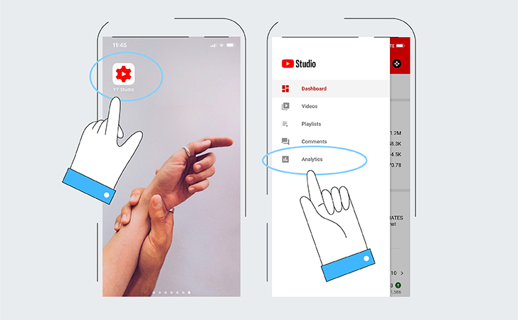Here’s how you get to YouTube channel analytics. Click on your user image in the top right corner. Go to YouTube Studio and choose the Analytics section from the left-hand menu.
